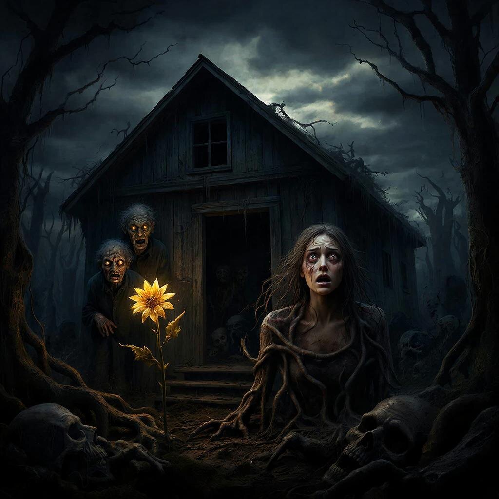 Отныне девушка стала частью этого кошмара. Цветок продолжал сиять ярким золотом, символизируя непрекращающуюся цепь преступлений. Она осознавала, что станет очередным звеном цепи душ, навеки оставшихся пленниками страшного дома.