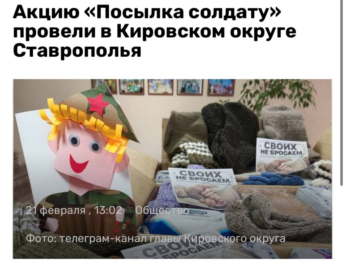 Жители посёлка Комсомолец в преддверии Дня защитника Отечества принесли в Дом культуры посылки с подарками для бойцов СВО. Об этом сообщил в соцсетях глава Кировского округа Николай Новопашин. В учреждении создан пункт сбора помощи для участников спецоперации. В акции «Посылка солдату» участвовали волонтёры и просто неравнодушные селяне. В качестве подарков защитникам оно положили в передачки самое необходимое в окопах: чай, сладости, сухари, солёное сало, средства гигиены, тёплые носки, связанные заботливыми руками женщин посёлков Фазанный и Комсомолец. Ранее волонтёры станицы Марьинской отправили на спецоперацию почти 200 маскировочных сетей.