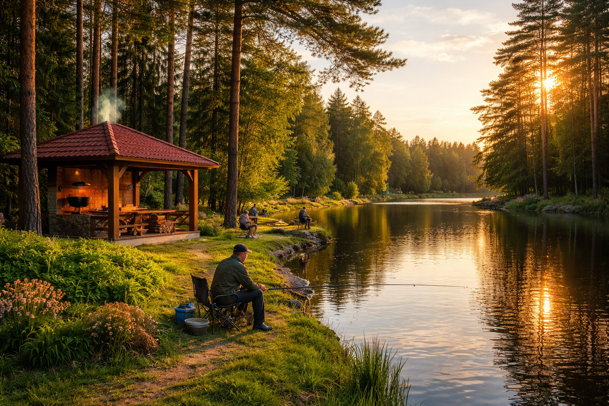 Это уже не просто рыбалка, это lifestyle-опыт с коптильней. На 29 км Новорижского шоссе расположен комплекс с естественным проточным водоёмом, окружённым высокими соснами.