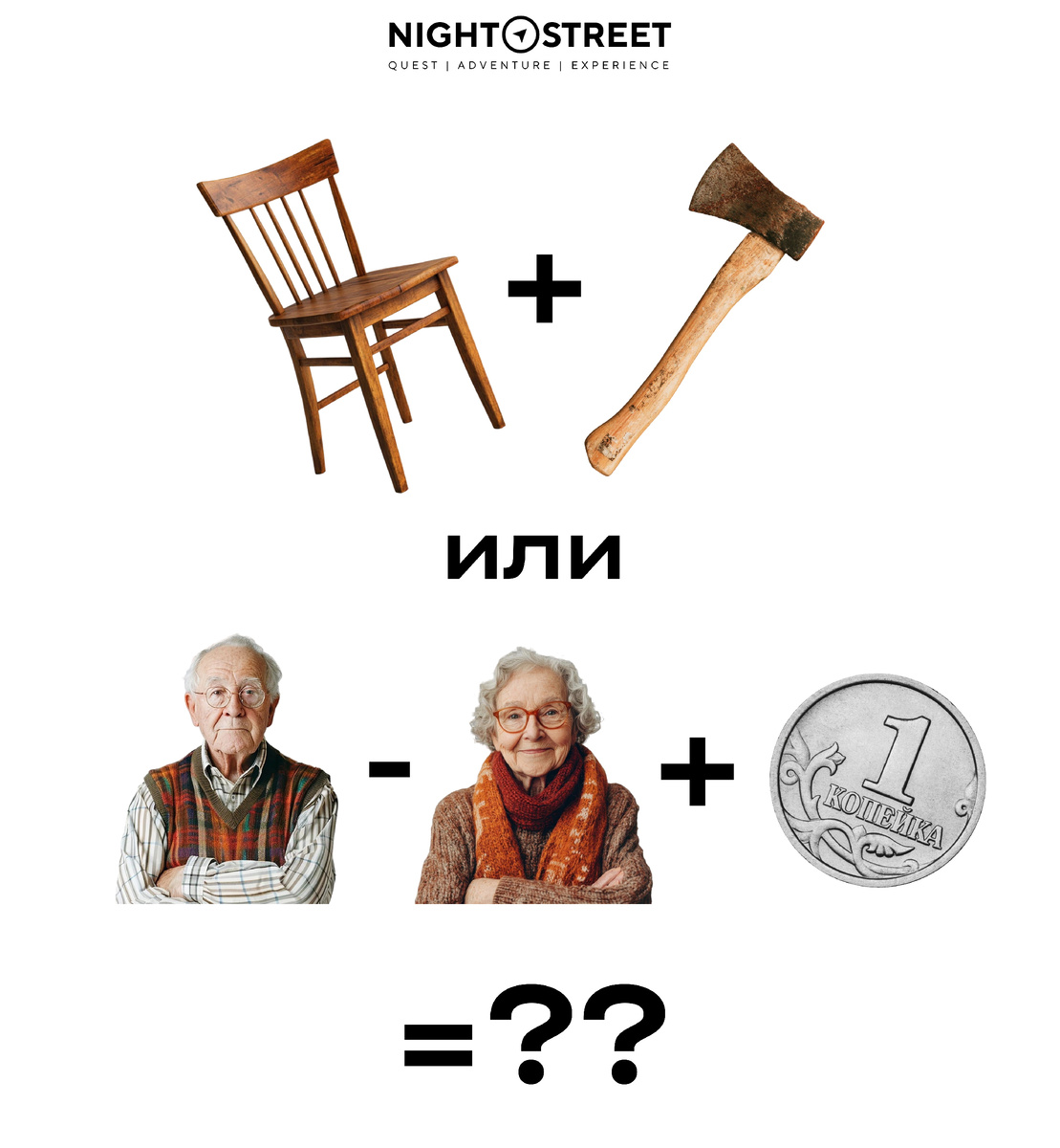 Загадки #АКТИВАЦИИ решаются логическим путём, но смекалка и эрудиция помогут вам быстрее найти правильный ответ. Внимательно посмотрите на картинку. В последовательности изображений скрыто уравнение. Решить его и найти ответ вам поможет одна знаменитая телевизионная передача, в названии которого много русского. Получившимся ответом делитесь в комментариях. На сайте NIGHT STREET вы найдёте онлайн- или офлайн-тимбилдинг, который подойдёт именно вашей команде.