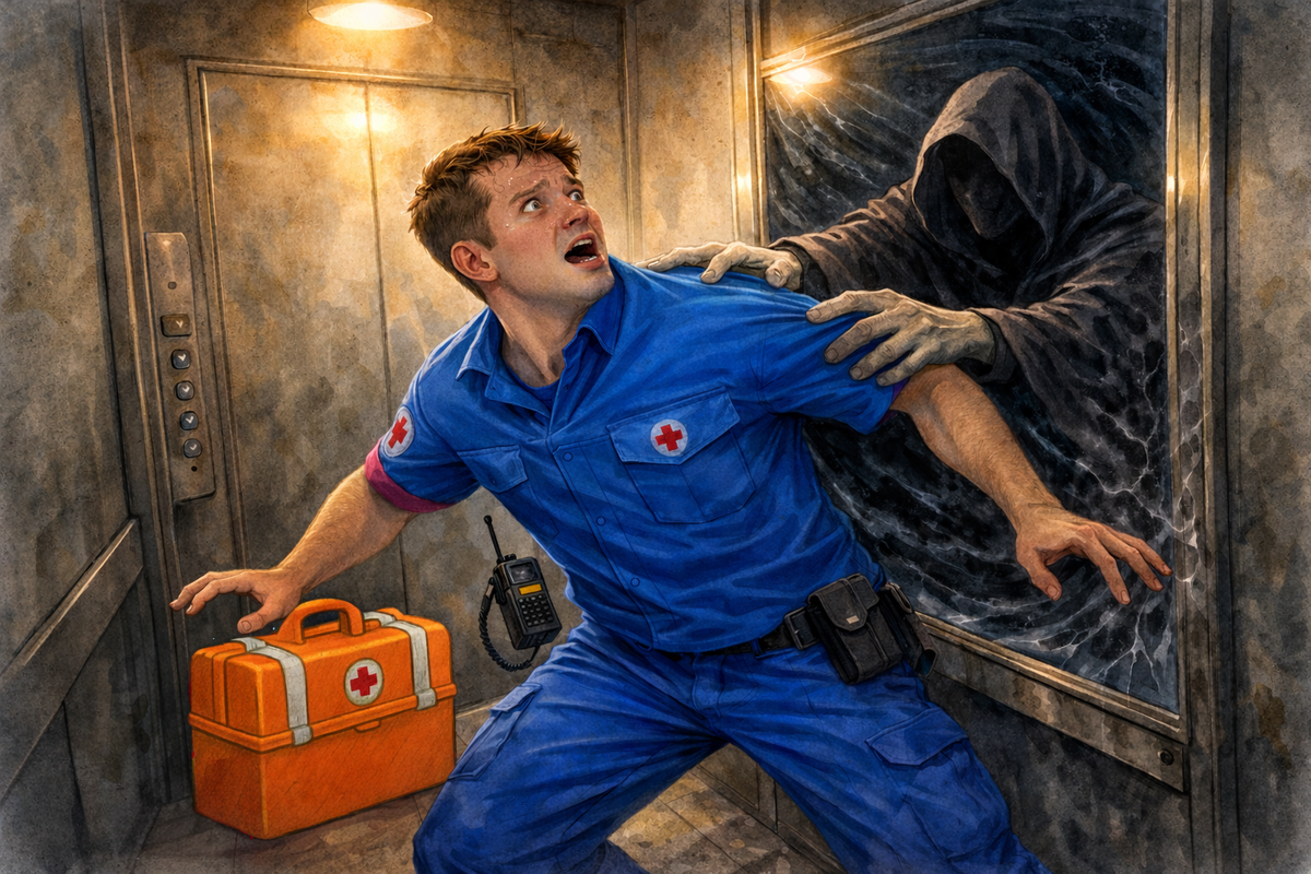 Не успел я набрать воздуха, как в кабине разлился тусклый желтоватый свет, а в зеркале — том самом, в которое я только что смотрелся, — внезапно проявился силуэт фигуры в тёмном балахоне. Незнакомец чуть повернулся боком, однако лица рассмотреть мне так и не удалось.
