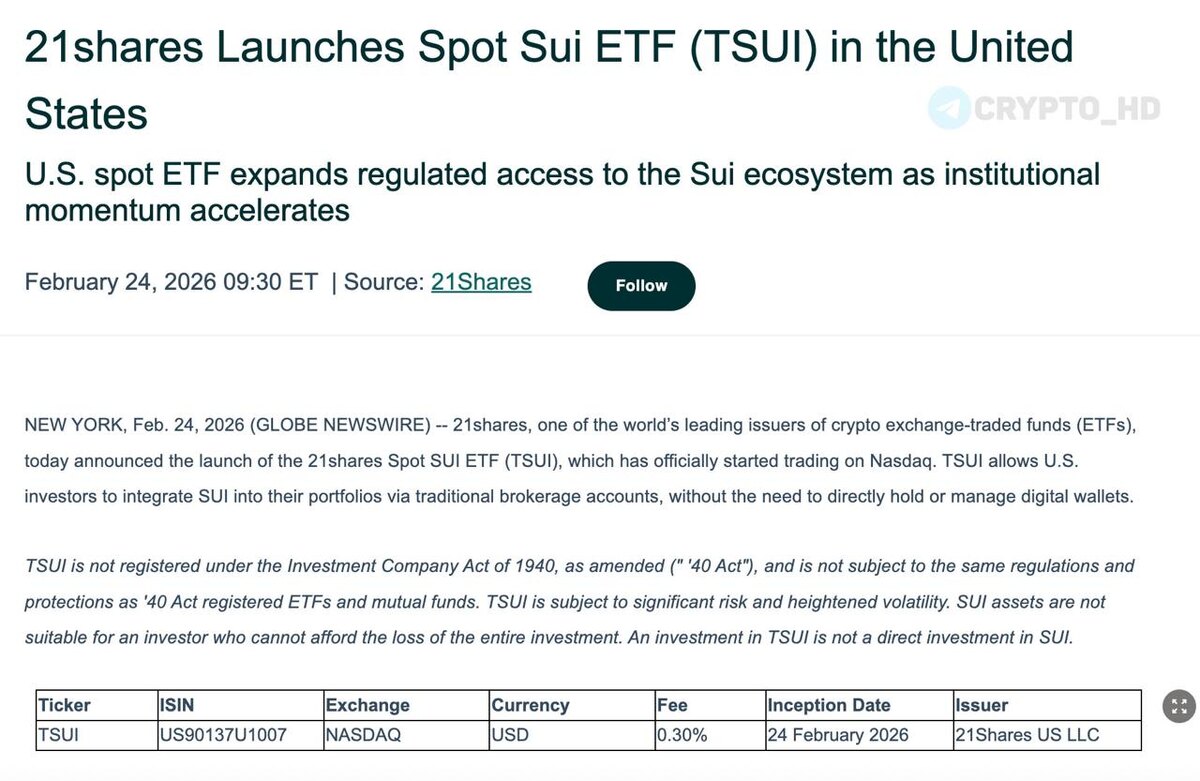 🔥🇺🇸 На Nasdaq состоялся листинг спотового Sui ETF от 21shares – анонс