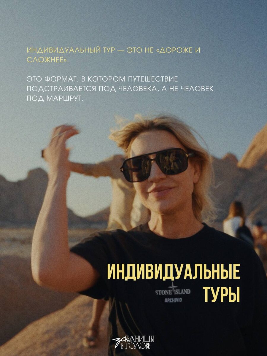 И я это прекрасно понимаю. Индивидуальные путешествия со смыслом «заГраницы в голове» — это формат для тех, кому важно не просто сменить страну, а прожить поездку глубоко и осознанно. Мы с командой создаем маршруты только по тем направлениям, которые знаем из личного опыта. Это принципиальная позиция: мы работаем там, где сами проходили дороги, проверяли логистику, учитывали реальные расстояния и понимаем ритм страны изнутри. Поэтому в работу берем только те страны, в которых можем уверенно назвать себя экспертами. Индивидуальный тур — это не про «дороже и сложнее». Его ценность в другом: маршрут подстраивается под человека. Под количество дней, интересы, физическую нагрузку, цели поездки и личный темп. Мы не используем готовые пакеты — каждая программа собирается с нуля, исходя из конкретного запроса. Все начинается с диалога. Важно понять, зачем вам это путешествие: за тишиной, природой, впечатлениями, сменой контекста или внутренней перезагрузкой. Уже после этого выстраивается сцена