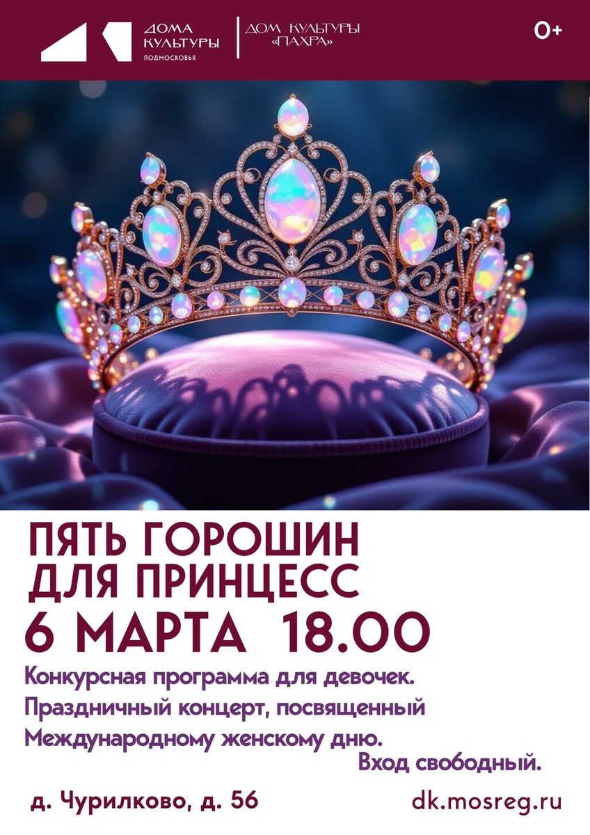 ✨ Приглашаем на чудесный весенний вечер! 🌸 Праздничная программа «Пять горошин для принцесс». Вас ждет увлекательный конкурс и яркий концерт, посвященный Международному женскому дню. 🌷 Приходите за порцией вдохновения, улыбками и праздничным настроением! Проведем этот вечер вместе, воспевая красоту и весну. ✨ 🚫 Возраст: 0+ 📆 06.03.2026🕒18:00 🏢 Сельский дом культуры (СДК) «Пахра» 📍 г.о.Домодедово, дер.Чурилково, ул.Чурилково, д.5Б 💰 Вход свободный❗️ ✅ Мероприятия Домодедово https://dzen.ru/id/66f10385cc4c5a16f7b5fb02 http://vk.com/domodedovo_events http://dzen.ru/domodedovo_events