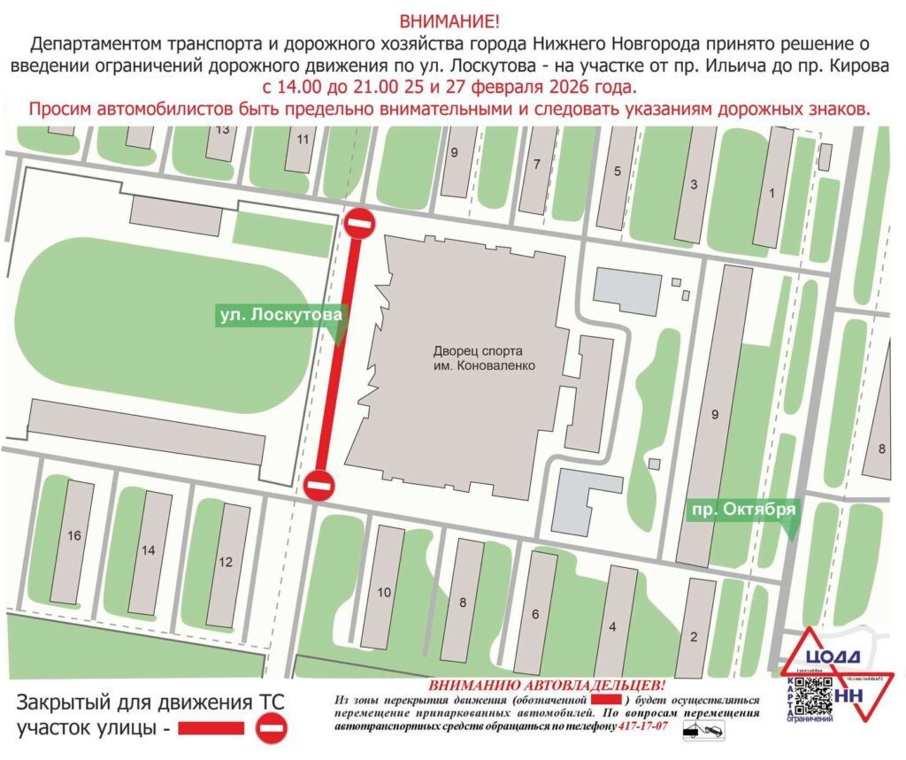 В Нижнем Новгороде на два дня ограничат проезд транспорта по улице Лоскутова. Об этом сообщили в пресс-службе городской администрации. Ограничения введут на участке улицы от проспекта Ильича до проспекта Кирова, рядом со Дворцом спорта им. Коноваленко. Транспорт не сможет проехать здесь с 14:00 до 21:00 25 и 27 февраля. Причина – проведение хоккейных матчей во Дворце спорта. «Просим водителей заранее переставить автомобили за пределы ограничительных зон. Оставленные в зоне действия ограничений транспортные средства подлежат принудительному перемещению. Информацию о перемещенных автомобилях можно узнать по телефону справочной службы: 417-17-07», — предупредили в администрации. Водителям рекомендуют следовать указаниям дорожных знаков. Напомним, проезд по участку улицы Львовской ограничат на четыре дня с 25 февраля.