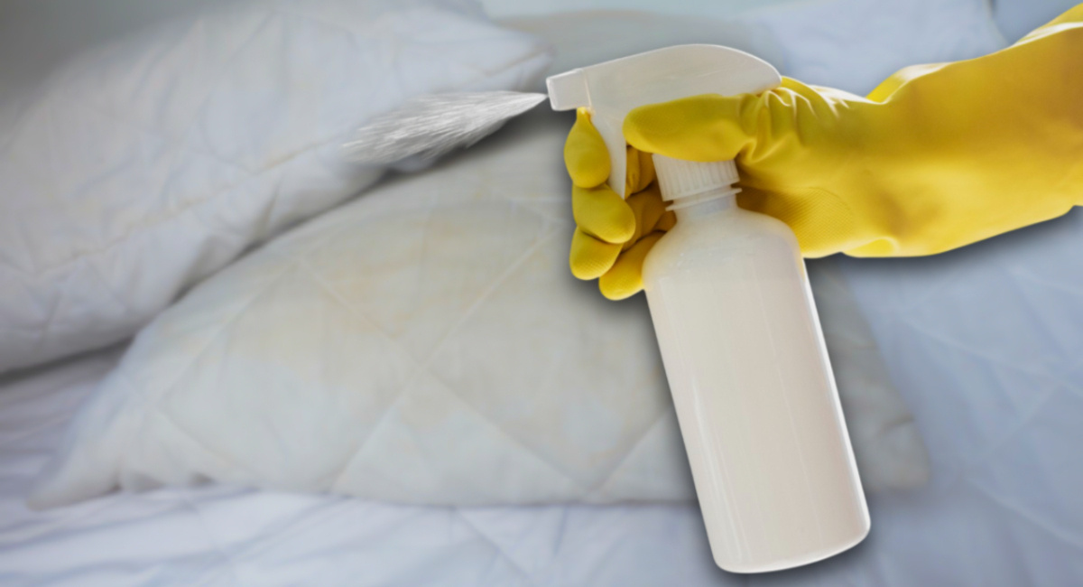 Просто распыляем и ждем 20 минут — желтые пятна с подушки сами сползают: без стирки и химчистки