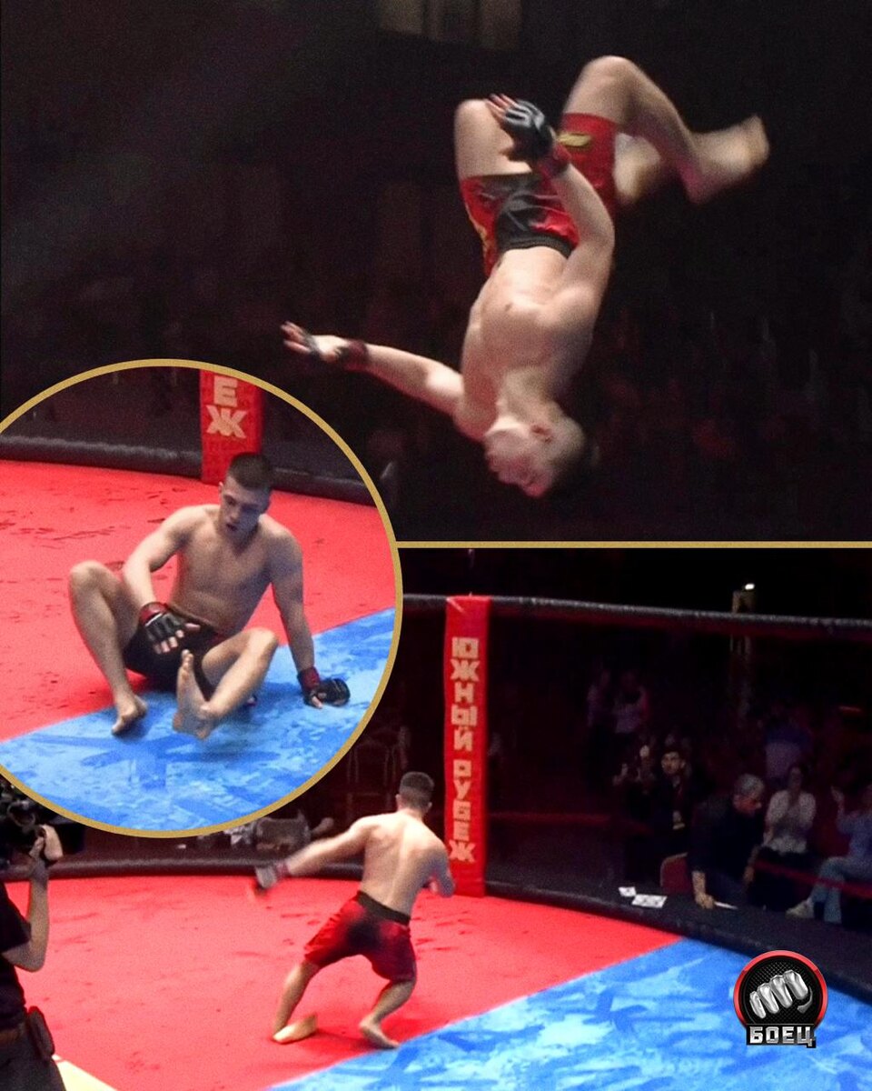 🤯 На турнире Южный рубеж 9 Александр Синещук в первом раунде финишировал соперника, а потом забрался на клетку, чтобы исполнить сальто. Но что-то пошло не так: он неудачно приземлился на левую ногу и повредил ее. Выглядело прям жутко. Спустя пару дней Физрук вышел на связь: тяжелых последствий травмы удалось избежать. Выводы сделаны, поэтому пожелаем просто побед без травм 👀 🗣️ Турнир понравился. Чуть не доработал сальто, но это ладно. Такого делать больше не буду. Буду праздновать свои победы поскромнее. Насчет ноги – ничего серьезного, вправили, сказали походить в гипсе. Пока на костылях. Сейчас залечим травмы и будем продолжать победную серию.