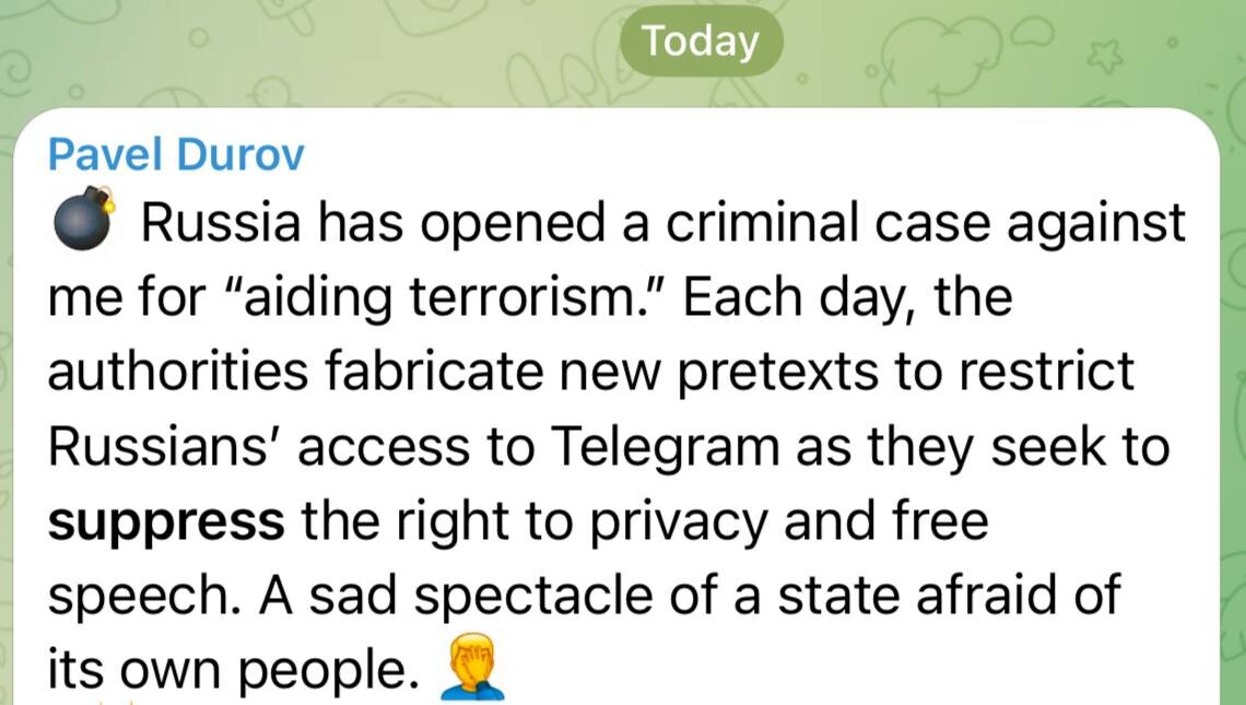 : Россия возбудила против меня уголовное дело по обвинению в «содействии терроризму». С каждым днём власти изобретают всё новые предлоги, чтобы ограничить россиянам доступ к Telegram, стремясь подавить право на частную жизнь и свободу слова. Печальное зрелище — государство, боящееся собственного народа.