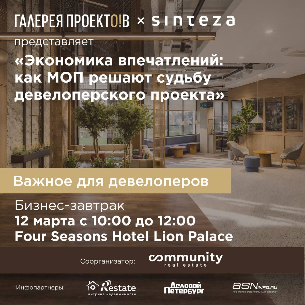 12 марта в северной столице пройдет закрытое отраслевое мероприятие «Экономика впечатлений: как МОП решают судьбу девелоперского проекта». В фокусе — места общего пользования как инструмент управления стоимостью проекта. Не абстрактный дизайн, а измеримые бизнес-метрики. Спикеры покажут на реальных кейсах — качественные МОПы могут добавлять до 30% к стоимости квадратного метра и снижать затраты на привлечение клиентов в 1,5–2 раза 💰 Московский ивент с этой животрепещущей темой собрал более 40 собственников и руководителей девелоперских компаний. И они уже знают, почему побеждает не тот, кто строит дешевле и больше, а тот, кто создает среду, за которую готовы платить. Спикеры • Юлия Кристова, генеральный директор Галерея Проектов х SINTEZA • Катерина Туник, управляющий партнер Галерея Проектов х SINTEZA • Михаил Гущин, вице-президент по маркетингу и продукту Группы RBI • Ирина Прощенкова, руководитель отдела разработки продукта Ленстройтрест • Дарья Веневцева, руководитель отдела пр