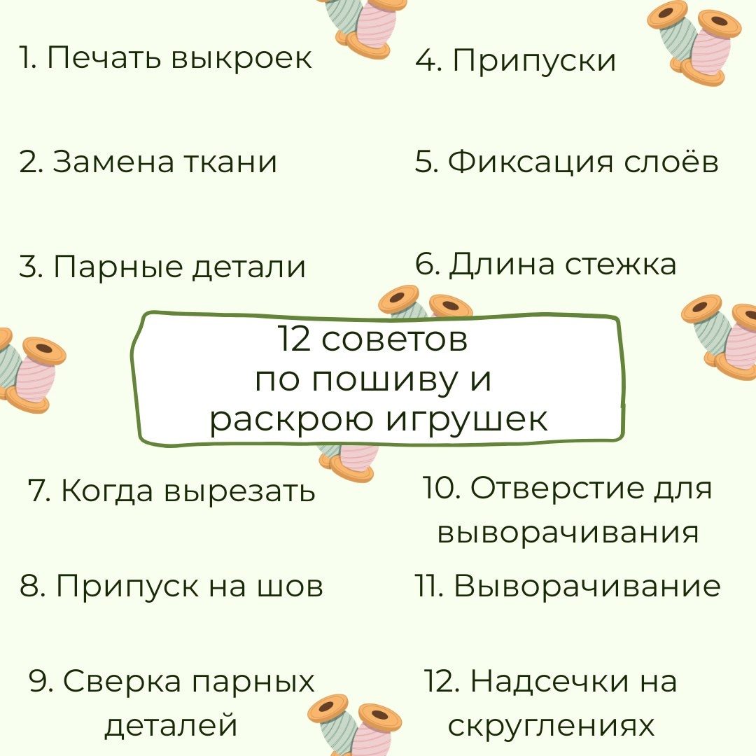 : 1. Выкройки: сохраняйте и печатайте в масштабе 100%, ориентация книжная. 2. Ткань: заменяйте только на подобную по эластичности. 3. Парные детали: кроите вместе. 4. Припуски: добавляйте при переносе на ткань. 5. Фиксация: используйте булавки или смётку. 6. Стежок: длина 2–2,5 мм, уменьшайте для маленьких игрушек. 7. Сначала прошивка, потом вырезание. 8. Шов: 3–5 мм припуск. 9. Проверка парных: сверяйте после прошивки до выворачивания. 10. Выворачивание: оставляйте отверстие в незаметном месте. 11. Медленно выворачивайте, расправляя ткань. 12. Скругления: делайте надсечки, оставляя 1–2 мм до шва. Делитесь, сколько пунктов вы делаете автоматически, и присоединяйтесь ку мини-курсу ЛЮБИМКИ! 😍 👉 https://mimido.ru/mk_rabbit?utm_source=tgkanal