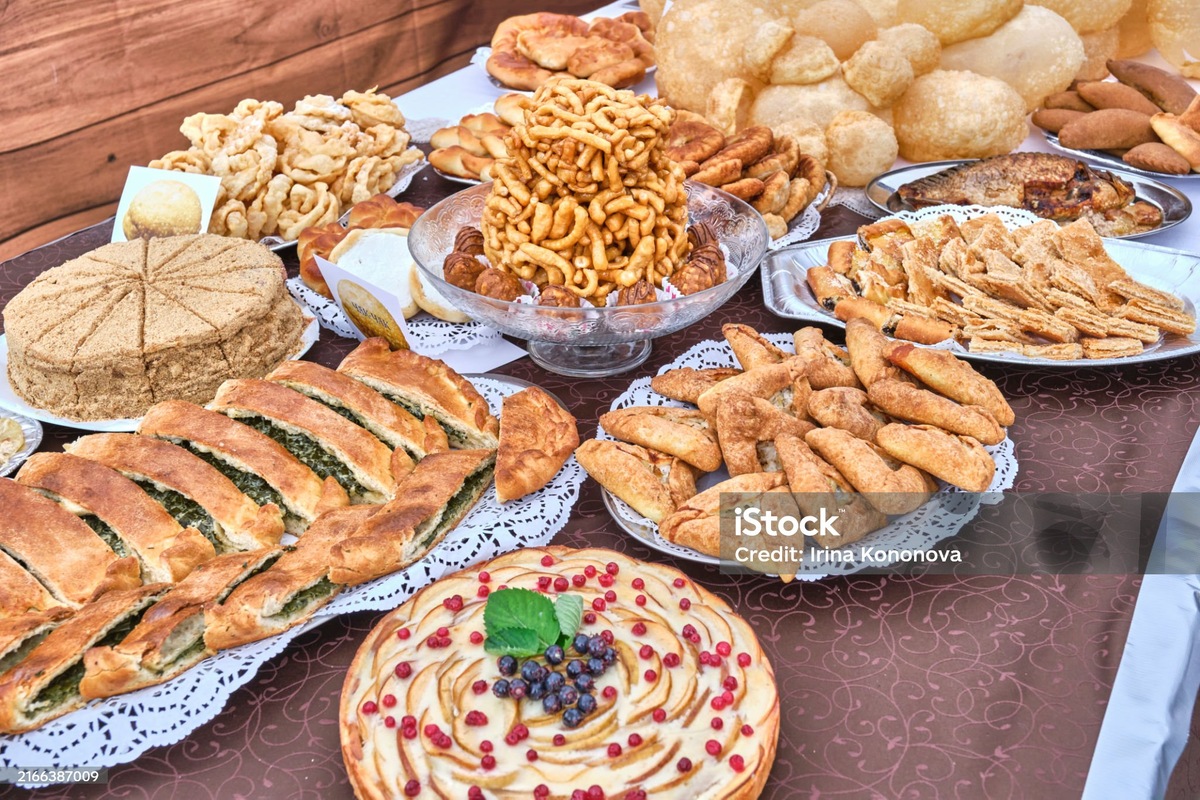 Баурсак (в переводе «стремление к объединению, кровные родственники») — десерт из полосок теста, обжаренных во фритюре и пропитанных мёдом или сахарным сиропом. Изготавливается в виде небольших пончиков круглой или квадратной формы. Подаётся в отдельном блюде. Форма имеет принципиальное значение! Например, на башкирской свадьбе в старину выполнялся любопытный ритуал — невеста готовила баурсак для родителей жениха. По внешнему виду десерта оценивали будущую хозяйку дома: если пончики крупные — считалось, что девушка не будет особо трудиться, если маленькие — будет скупой. Поэтому необходимо было нарезать баурсак идеальными кусочками.