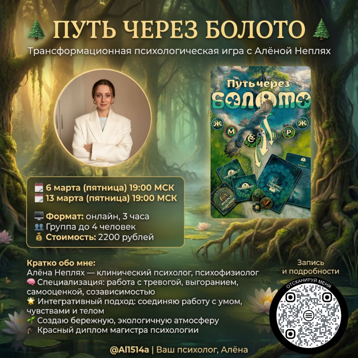 » Друзья, записала для вас небольшое видео.⤴️ А для тех, кто любит читать — собрала главное здесь ЧТО ЭТО ЗА ИГРА? ➡️https://taplink.cc/boloto «Путь через Болото» — это глубокая психологическая работа, упакованная в сказку. Мы будем исследовать ваши сложные цели, страхи и внутреннее сопротивление через встречи с обитателями болота. Водомерка, Росянка и сама Баба-Яга помогут увидеть то, что обычно прячется. Это не развлечение. Это 3-часовая трансформационная сессия в мини-группе под моим сопровождением. ДАТЫ И ВРЕМЯ ✅ 6 марта (пятница) в 19:00 МСК ✅ 13 марта (пятница) в 19:00 МСК по времени - 3 часа. СТОИМОСТЬ 2200 рублей. По сути, цена ниже стоимости моей одной консультации. КОЛИЧЕСТВО МЕСТ Всего 4 человека в группе. Чтобы было достаточно глубины и внимания каждому. КОМУ ЭТО МОЖЕТ БЫТЬ НУЖНО ✔️ Если «увязли» в важной цели и не знаете, как двигаться дальше ✔️ Если чувствуете страх, тревогу, внутреннее сопротивление ✔️ Если будущее пугает, а настоящее истощает ✔️ Если внутренни