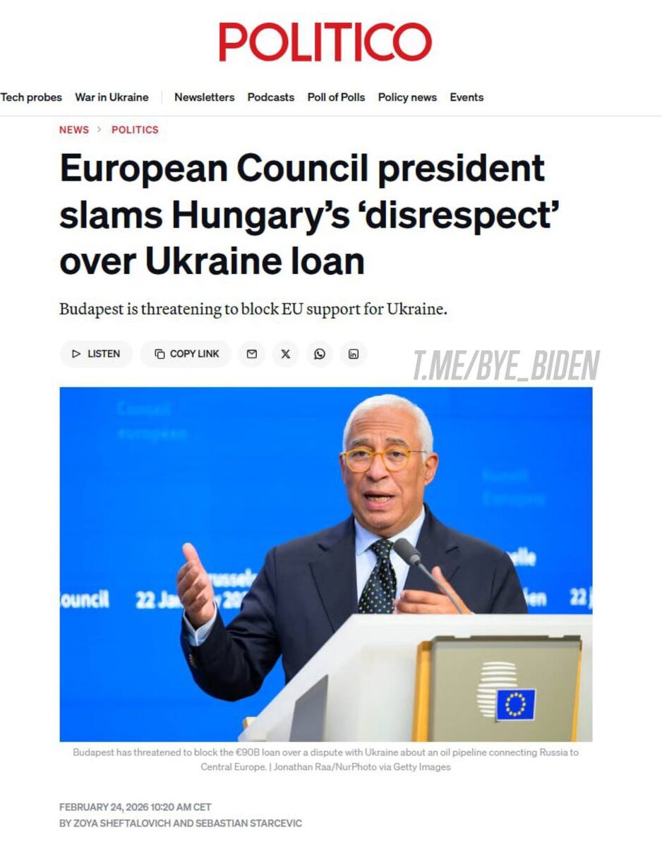 Глава Евросовета Антониу Кошта призвал Будапешт не тормозить кредит для Украины на €90 млрд. Венгры угрожают сорвать принятое еще в декабре решение после новых украинских ударов по нефтепроводу «Дружба». «Мы говорили об этом, мы договорились, и мы должны исполнить это. Никто не может проявлять неуважение к решениям Евросовета», — пожаловался Кошта в интервью Politico. А есть хоть одна причина их уважать? 👍«БайБайден» в МАХ