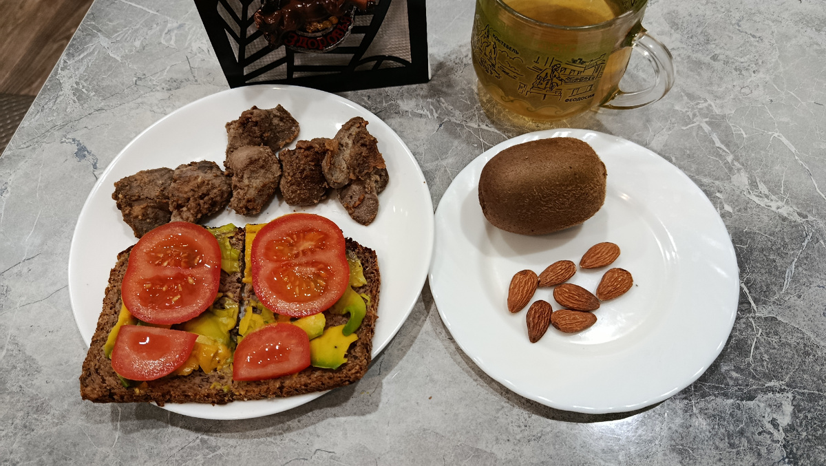 Вчера тушила куриную печень с луком. На завтрак сегодня взяла 95г. Приготовила 2 бутерброда из цельно зернового хлеба ,1/2 авакадо,1/2 помидорки. Вес 2 бутербродов - 120 г.