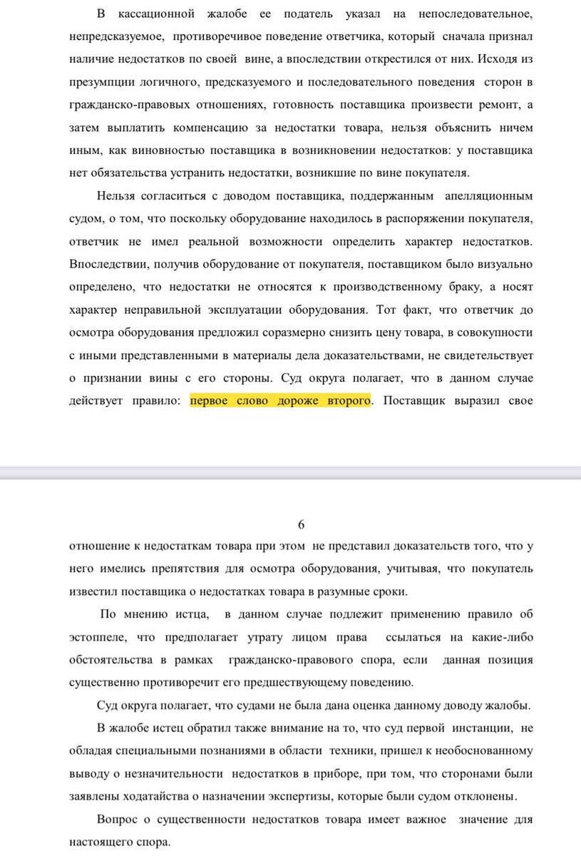 Арбитражный суд Московского округа в своём постановлении по делу о споре качества товара указал, что «первое слово дороже второго» (дело № А40-146414/2023). Известный с детства принцип ведения полемики гласит: «первое слово съела корова» ставит крест на любых возражениях. Ответчик, судя по его позиции в суде предпочел не использовать своё секретное оружие.