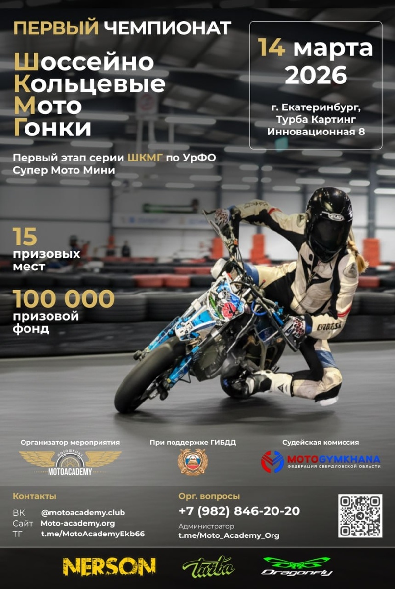 Организатор Чемпионата - МотоАкадемия moto-academy.org При поддержке ГИБДД Свердловской области. Судейский состав: Федерация МотоДжимханы Свердловской области - судейские лицензии Федерации мотоспорта России Чемпионат ШКМГ состоит из 3-х серий Первый этап пройдёт 14 марта в Екатеринбурге, ТУРБА Картинг, Инновационная 8 Участвуют 3 квалификационные группы 27-31 сек 31-35 сек > 35 сек Призовой Фонд от 100 000 Р 15 призовых мест 3 основных и 2 доп. номинации: стабильный райдер, приз зрительских симпатий Приглашаем всех желающих, попробовать свои силы. Для каждого заезда свой уровень райдеров. В гонках будут участвовать и наши Курсанты, выпуск 2025г. Участвуй в Первом Чемпионате - войди в историю Уральского мотоспорта! Квалификация на время проходит на тренировках ШКМГ МотоАкадемии После квалификации, вы получаете стартовый номер - и для вас индивидуальные условия тренировок до чемпионата: 1 отработка старта 2 тактики обгона 3 индивидуальная цена Напишите Админу МА в Телеграм, она подробно