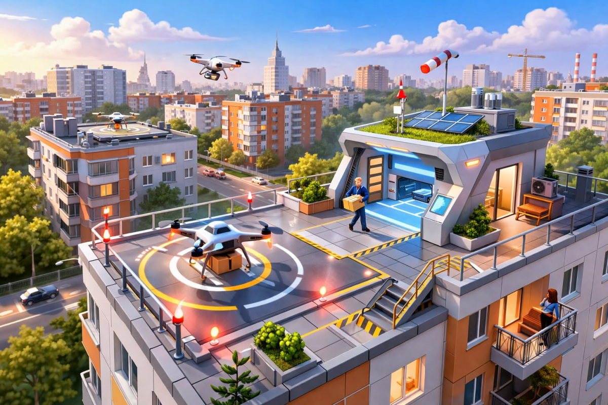 Во дворах и на крышах жилых домов могут появиться дронопорты после того как Минтранс России разработает нормативную базу для доставки