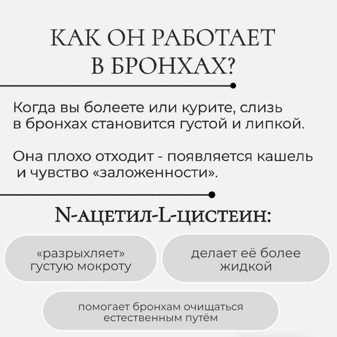 ? Когда мы болеем, слизь в бронхах становится густой и липкой. Она плохо выводится, «застаивается», усиливает кашель и мешает нормальному дыханию. Организм пытается очиститься - отсюда постоянное покашливание, чувство тяжести в груди, ощущение, что «что-то не отходит». Как здесь работает N-ацетилцистеин (NAC)? NAC - это муколитик. Он: • разжижает густую мокроту • снижает её вязкость • помогает бронхам очищаться естественным путём Проще говоря - он не подавляет кашель, а помогает сделать его продуктивным. 📌Мокрота начинает легче отходить, дыхание становится свободнее, а восстановление проходит быстрее.