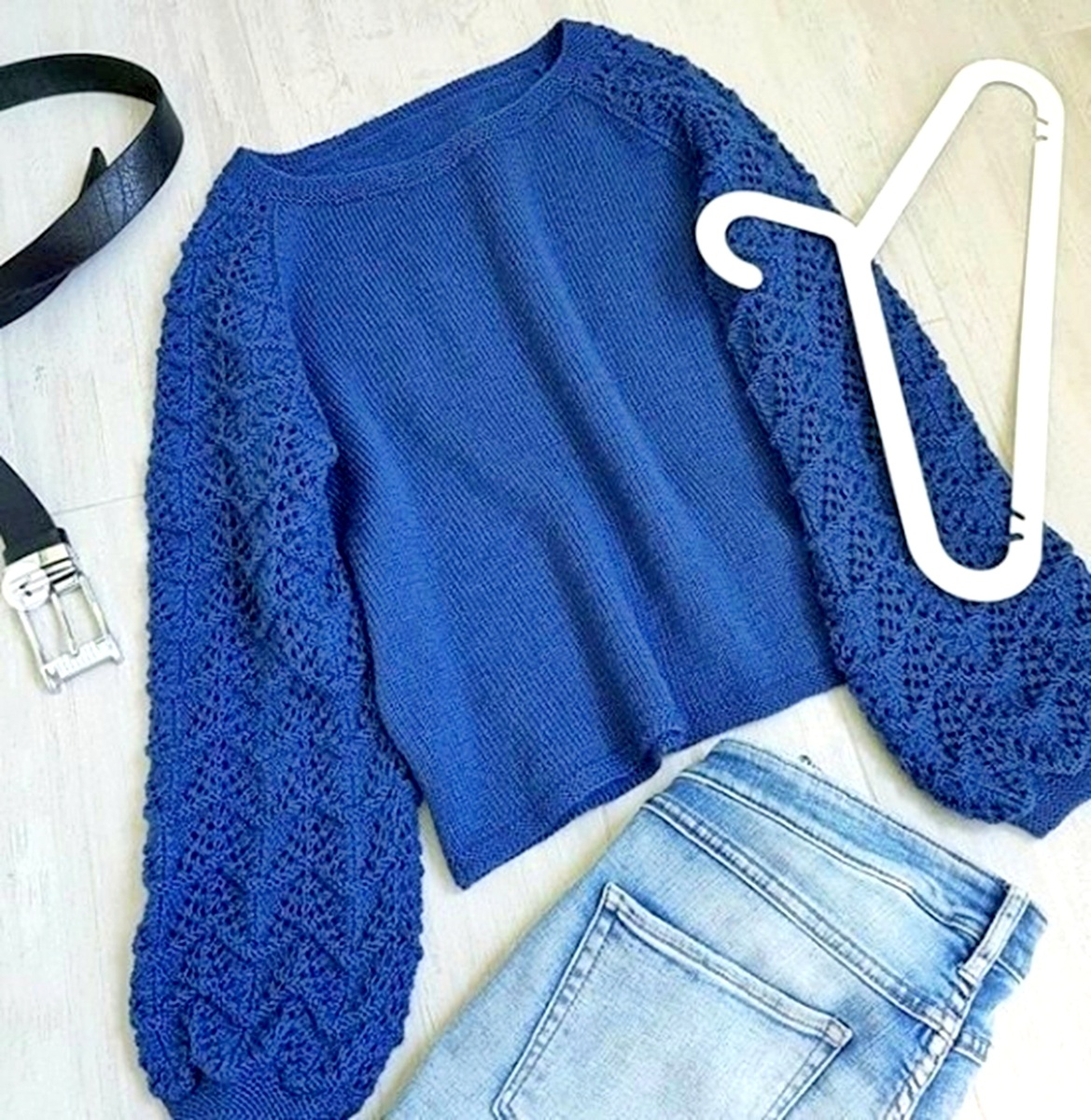 № 1: Васильковый пуловер с пышными ажурными рукавами ♥