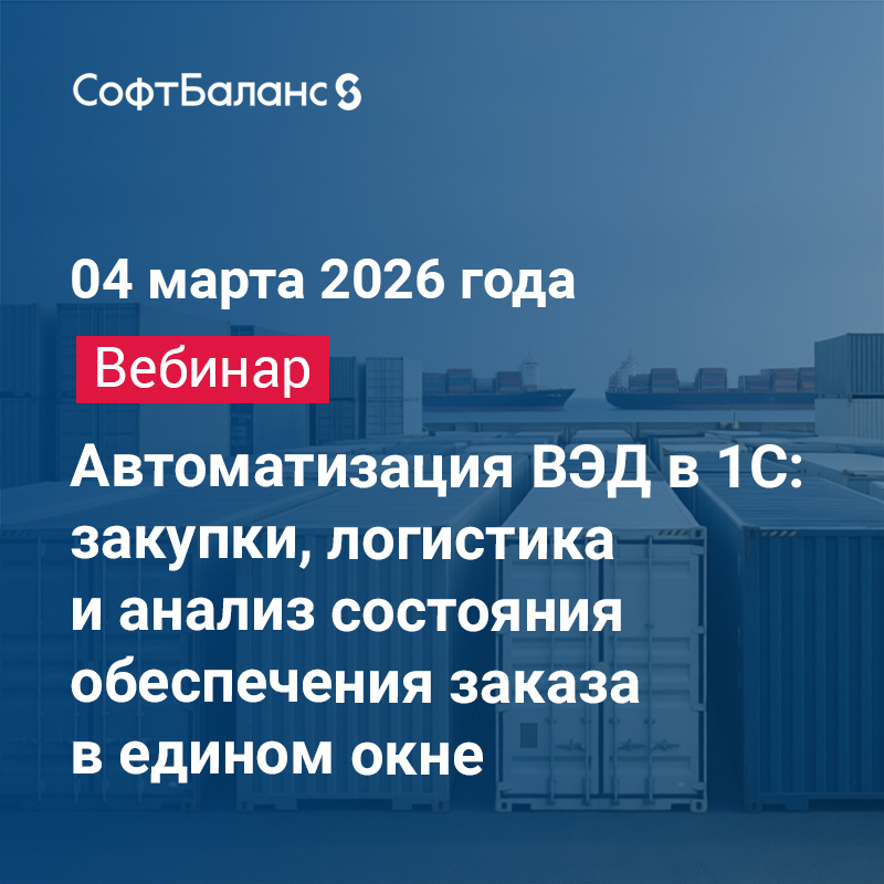 Группа компаний "СофтБаланс" приглашает вас на бесплатный вебинар "Автоматизация ВЭД в 1С: закупки, логистика и анализ состояния обеспечения заказа в едином окне". Логисты, закупщики и руководители ежедневно живут в режиме аврала: где груз, когда придёт, сколько в итоге будет стоить и какие документы опять не сошлись. Ручное планирование, разрозненные файлы, ошибки в расчётах и хаос в коммуникациях приводят к простоям, штрафам и принятию неэффективных решений. Чем больше объёмы закупок — тем выше нагрузка, риски и стресс для всей команды. На вебинаре покажем, как готовое решение для 1С – АРМ "Логистика ВЭД", предназначенное для управления международными цепочками поставок, превращает хаос в прозрачную систему: Разберём, кому подходит решение, приведем реальные кейсы автоматизации торгово-производственных компаний и ритейла. А также расскажем, как быстро запустить АРМ в вашей 1С (решение полностью совместимо с 1С:ERP, 1С:КА, 1С:УТ, 1С:ERP УХ). Бонус для участников: экспресс-аудит по пе