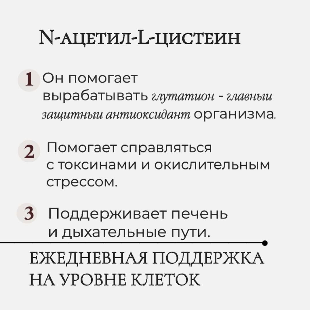 NAC - это не только муколитик. Он участвует в синтезе глутатиона - главного клеточного антиоксиданта. А значит: • поддерживает печень • помогает в процессах детоксикации • защищает клетки от окислительного стресса Поэтому ацетилцистеин используют не только при заболеваниях дыхательных путей, но и как системную антиоксидантную поддержку. N-ацетил-L-цистеин https://ru.siberianhealth.com/ru/shop/catalog/product/501641/?referral=6126636 📌Это не симптоматическая помощь, а работа на глубоком - клеточном - уровне. Поддержка, которая помогает организму справляться с нагрузками каждый день.