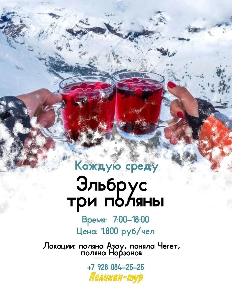 ! 🌿 Посетим три поляны: Азау, Чегет и Нарзаны. 🚗 Выезд 24 февраля в 07:00, возвращение около 18:00. 💲 Всего 1800 рублей с человека. Зарядитесь бодростью и положительными эмоциями от невероятных панорам гор и свежего альпийского воздуха! Присоединяйтесь к весёлой компании любителей активного отдыха и новых впечатлений! Информация о нас: 💙Наш адрес: г. Нальчик, пр. Ленина, 32, гост. Россия, оф. 245. 💙Подробнее на сайте: pelican07.ru 💙Позвоните: +7 928 084 25 25, +7 918 728 39 79 #экскурсии #горы