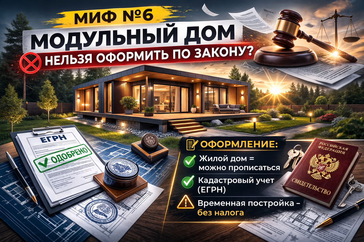Фразу «модульный дом не зарегистрируют» я слышу регулярно. Кто-то где-то сказал, сосед «точно узнавал», знакомый юрист «вроде бы сталкивался». Источник обычно размытый, зато уверенность железная.