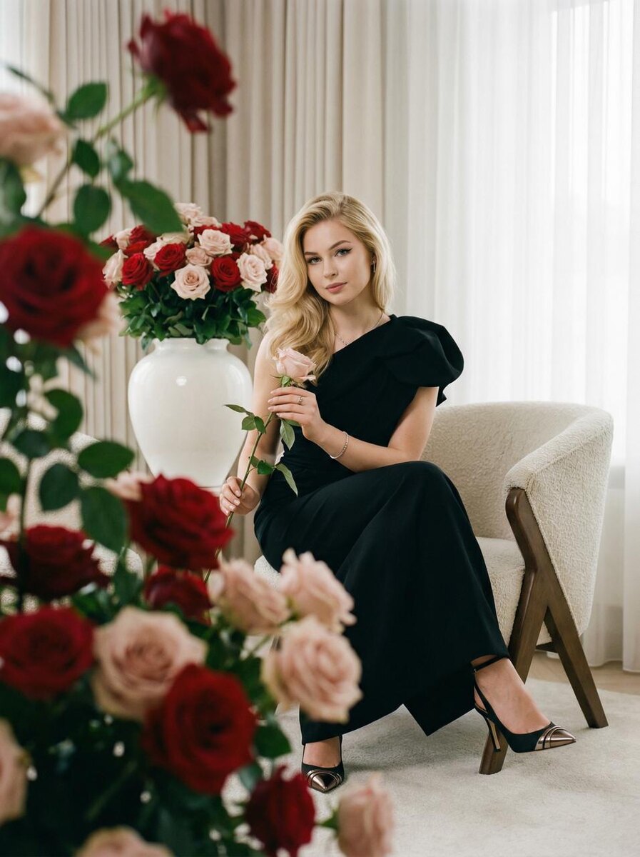 " Модель: Nano Banana Сгенерировать🪄 [ИСПОЛЬЗОВАТЬ ЭТАЛОН ЛИЦА] — строго следуя чертам лица с эталонного изображения, модель должна выглядеть как на референсе, портрет в стиле роскошного образа жизни, с элегантным и женственным присутствием. [ВЗГЛЯД ИЗ-ЗА ЦВЕТОВ] — кадр снят сквозь цветы: размытый передний план (foreground bokeh), мягкий размытый фон перед моделью, глубина резкости подчеркивает лицо. Модель грациозно сидит рядом с огромным букетом роз, нежно держа в руке один стебель цветка. Уверенная, спокойная поза. Кинематографическое, интимное настроение. Волосы блестящие, с естественным здоровым сиянием, шелковистой текстурой, отражение света как в рекламе Pantene. Безупречный современный стиль: стрелки на глазах, мягкий глэм-макияж, атмосфера вечной роскоши. Цвет и длину волос сохрани с исходного изображения. [ОДЕЖДА И ЛОКАЦИЯ] — современное черное вечернее платье со скульптурным силуэтом, изящные босоножки на высоком каблуке с металлическими акцентами, минималистичные ювели