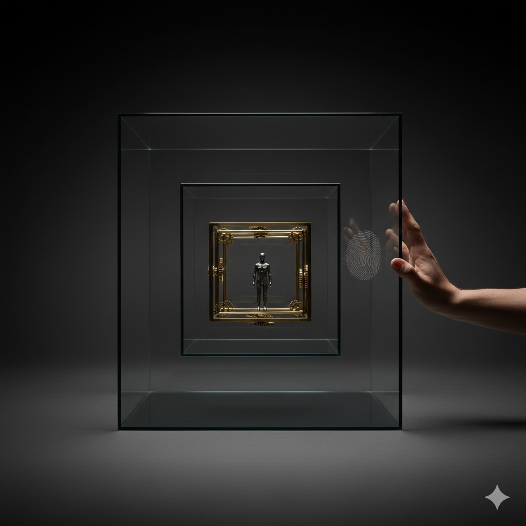 Это похоже на компьютер, который начал анализировать собственный код, но делает это с помощью того же кода - единственного доступного ему. Он не может выйти «наружу», чтобы увидеть систему целиком. Он может понять логику взаимодействия, но ничего не знает о том, что находится снаружи.