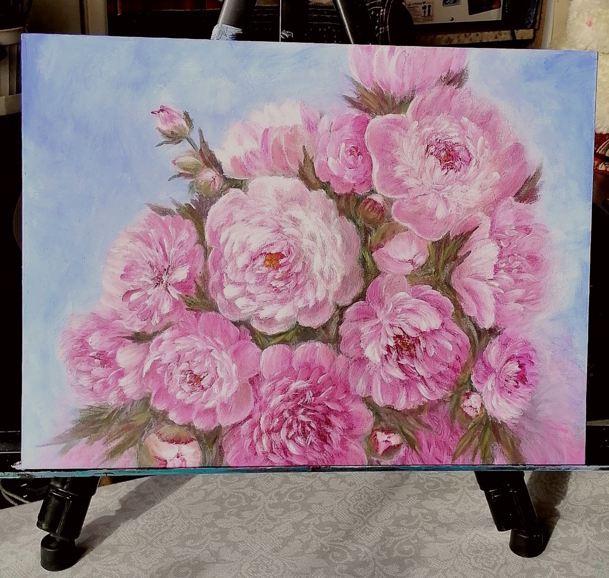! . Наконец-то у меня получились пионы, которые мне больше не хочется переделывать))) Третий раз переписала. И они из белых превратились в розовые))) Но теперь пионы выглядят как живые, а не пластиковые. Отличный подарок на 8 марта - дома всегда будет букет шикарных пионов. . Холст на картоне, 30х40см, акрил. По всем вопросам в лс София Балушкина #пионы #розовыепионы #картинаспионами #подароклюбимой #подарокжене #точкиотсофико