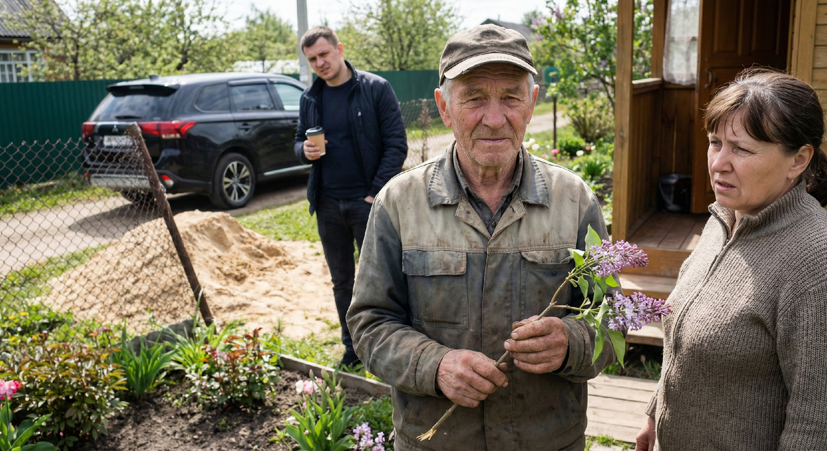 Прямо за их сетчатым забором огромный жёлтый КамАЗ медленно поднимал кузов. Тонны речного песка с влажным, тяжелым шуршанием поползли вниз. Сетка-рабица жалобно скрипнула, накренилась и рухнула под тяжестью песчаной лавины. Песок безжалостно похоронил под собой гордость Петра Ильича - три куста персидской сирени, которые он бережно выращивал последние десять лет.