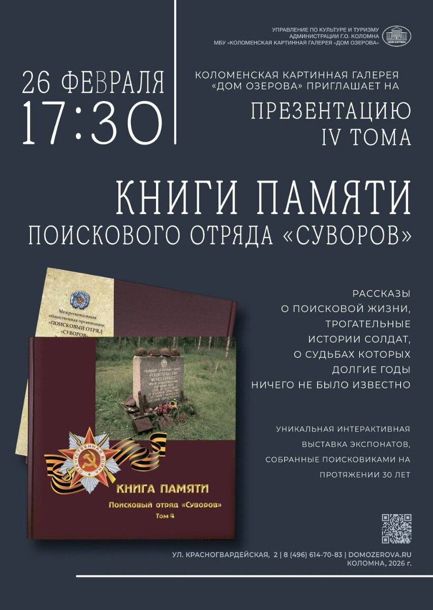 26 февраля в 17:30 Коломенская картинная галерея "Дом Озерова" приглашает на презентацию IV тома Книги Памяти поискового отряда "Суворов