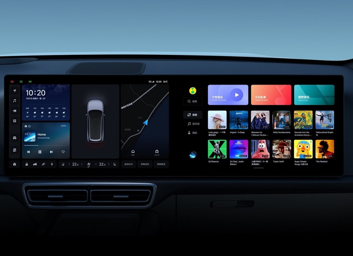 Экран мультимедиа Lixiang организован через виджеты: погода, музыка, навигация, состояние заряда. Док-панель внизу дает доступ к климату, громкости и быстрым настройкам без перехода в подменю.