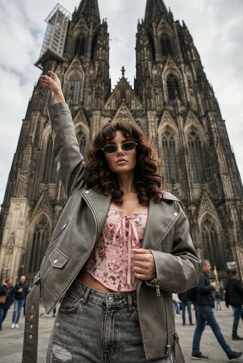 🤩 Ultra-realistic cinematic fashion photo, Cologne, Germany, clearly recognizable Cologne Cathedral (Kölner Dom) filling the background with towering gothic architecture, shot from low angle 28mm lens to emphasize scale. Stylish woman in medium shot (mid-thigh up) standing close to camera, one arm lifted upward toward the cathedral spires, other hand holding the lapel of her oversized matte grey leather jacket. Outfit: oversized structured grey leather jacket, fitted floral corset with pink micro print and ribbon lacing, high-waisted distressed grey jeans. Accessories: narrow minimal sunglasses. Hair: soft fringe with voluminous natural curls, wind moving the hair. Lighting: natural cloudy daylight, soft cinematic European light. Atmosphere: people softly blurred in motion behind for realism and scale. Color grading: muted tones, Peter Lindbergh editorial style. Shot by a renowned German fashion photographer for Vogue Germany. Germany clearly identifiable, realistic textures, cine