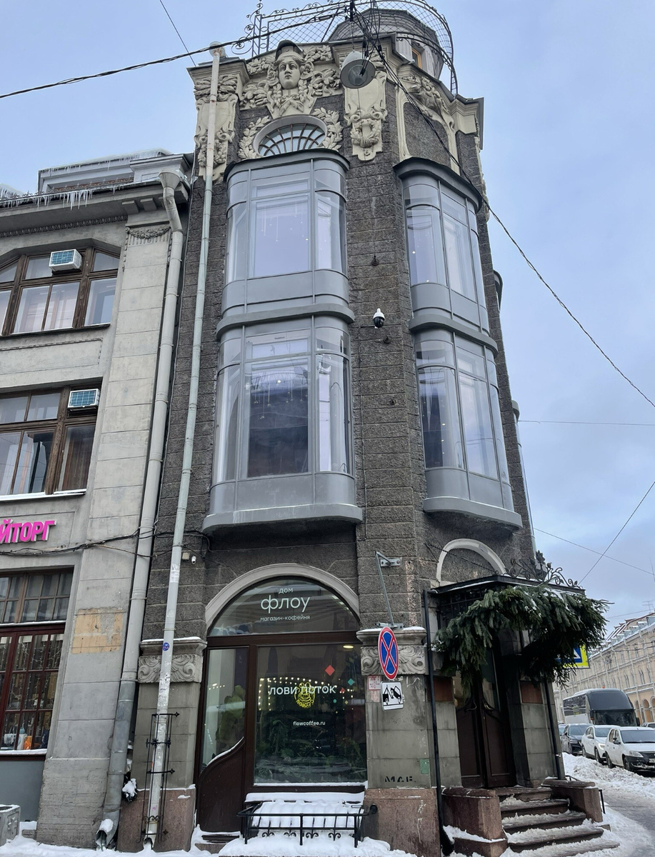 На Садовой улице прямо напротив Апраксина двора находится очень красивое здание в стиле модерн. Кто помнит, в 90-е годы здесь располагался большой свадебный салон (это были эффектные витрины).