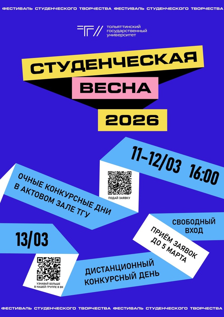 ! Направления фестиваля: 🔹 музыкальное; 🔹 танцевальное; 🔹 театральное; 🔹 оригинальный жанр; 🔹 медиа; 🔹 видео; 🔹 арт; 🔹 Шум Весны. 📌 Для участия необходимо подать заявку до 5 марта 2026 года. Очные конкурсные дни пройдут 11-12 марта в 16:00, а 13 марта – дистанционный конкурсный день. ❗️ Вход свободный. В ТГУ действует пропускной режим, при себе необходимо иметь документ, удостоверяющий личность. Подробности – в положении👈 🙂 САЙТ | 👻 MAX | 💙 ВК | 📝 ДЗЕН
