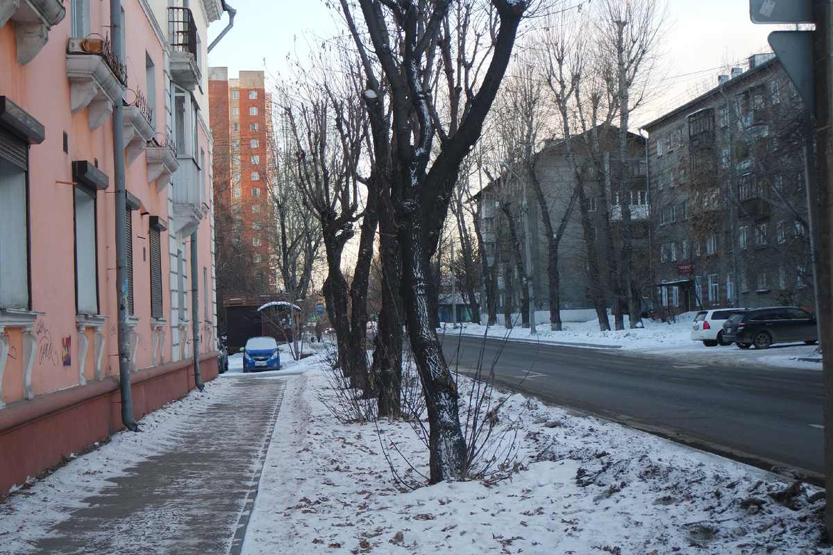 Начнём мы нашу фотопрогулку на углу с шумной Маяковского - тут такое... место, ибо остановка общественного транспорта. Сколько раз я отсюда уезжала на автобусе!.. Думаю, что большинство иркутян, которые оказывались в этом районе, так или иначе, бывали/cтояли здесь: