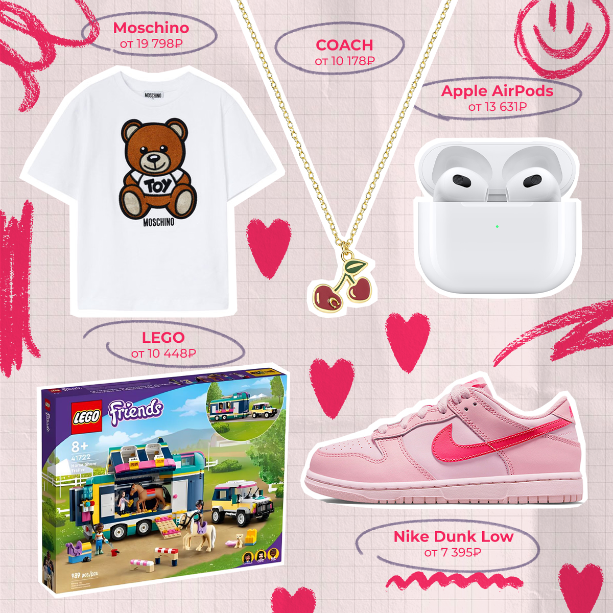 Или для любой юной мадам, которую хочется порадовать на 8 марта. Баловать же нужно с детства, да? Nike Dunk Low, цена от 7 395₽* LEGO, цена от 10 448₽* COACH, цена от 10 178₽* Moschino, цена от 19 798₽* Apple AirPods, цена от 13 631₽* *стоимость может изменяться в зависимости от курса и размера Больше интересного на нашем сайте POIZON