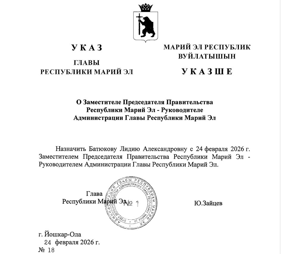 Администрации Главы республики. Документ вступает в силу с 24 февраля. Назначению предшествовало изменение структуры исполнительной власти. Указом от 20 февраля должность руководителя Администрации Главы Марий Эл была дополнена статусом заместителя Председателя Правительства региона. 📌В октябре 2024 года, напомним, Лидия Батюкова была назначена на должность руководителя Администрации Главы Марий Эл, а ранее она возглавляла Минспорттуризма региона. 📲 Подписывайтесь на «МП» в МАХ