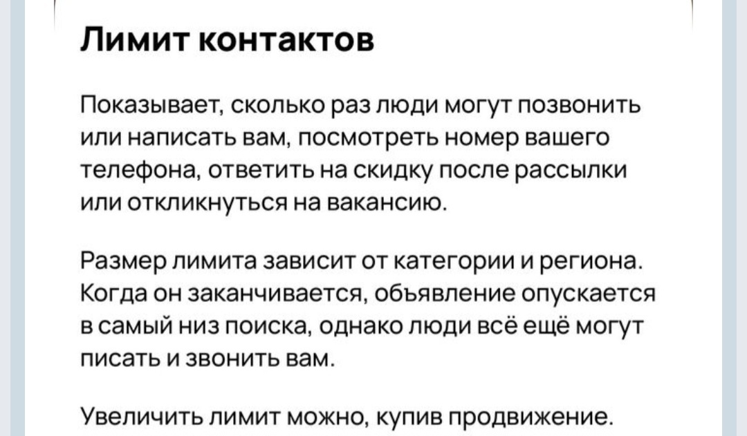 Спасибо, что хоть полностью не обрубили возможность связываться с покупателями или продавцом за деньги. После истечения лимитов вам всё-равно можно будет написать или позвонить.