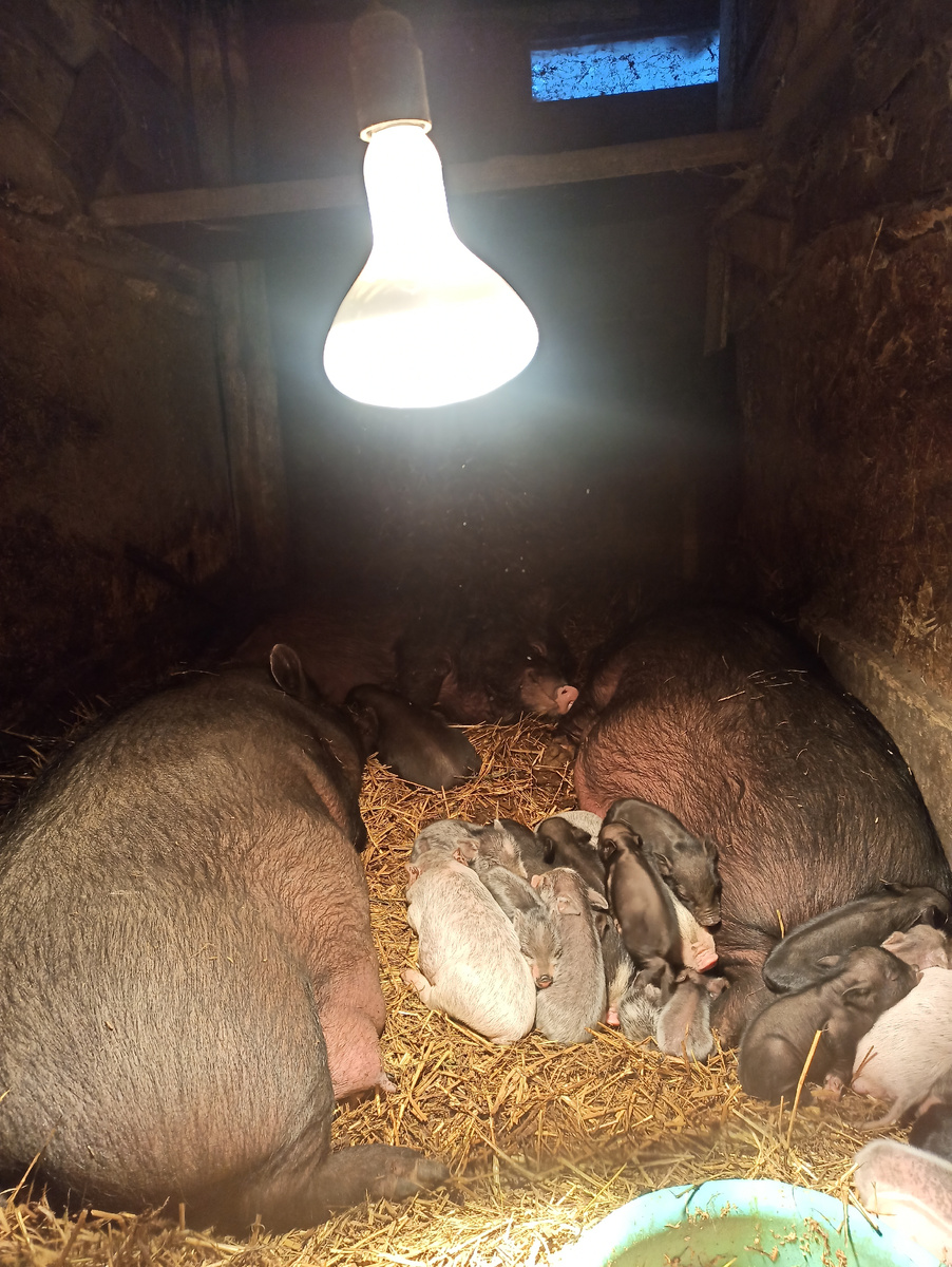 Свиноматки начали пороситься с января месяца. Пять голов уже с поросятами, остальные позднее будут. Мы в этом году им как попало крыться не позволили. Все идут согласно составленного графика, так сказать. Частями. Так удобнее. Самых первых уже даже распродали почти всех.