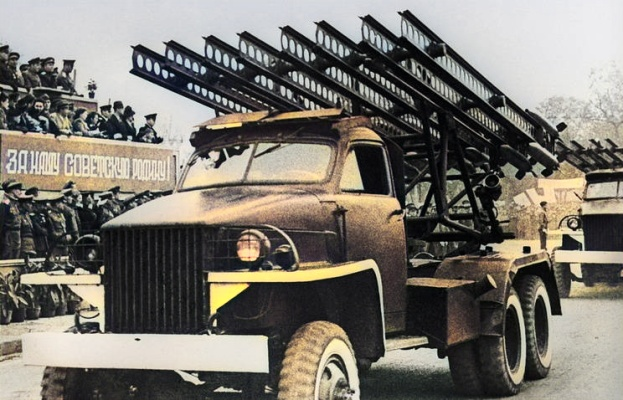 БМ-13, самая первая советская система, где в качестве боевого заряда использовались реактивные снаряды, была создана фактически сразу перед началом войны ССС с Германией, в августе 1941.
