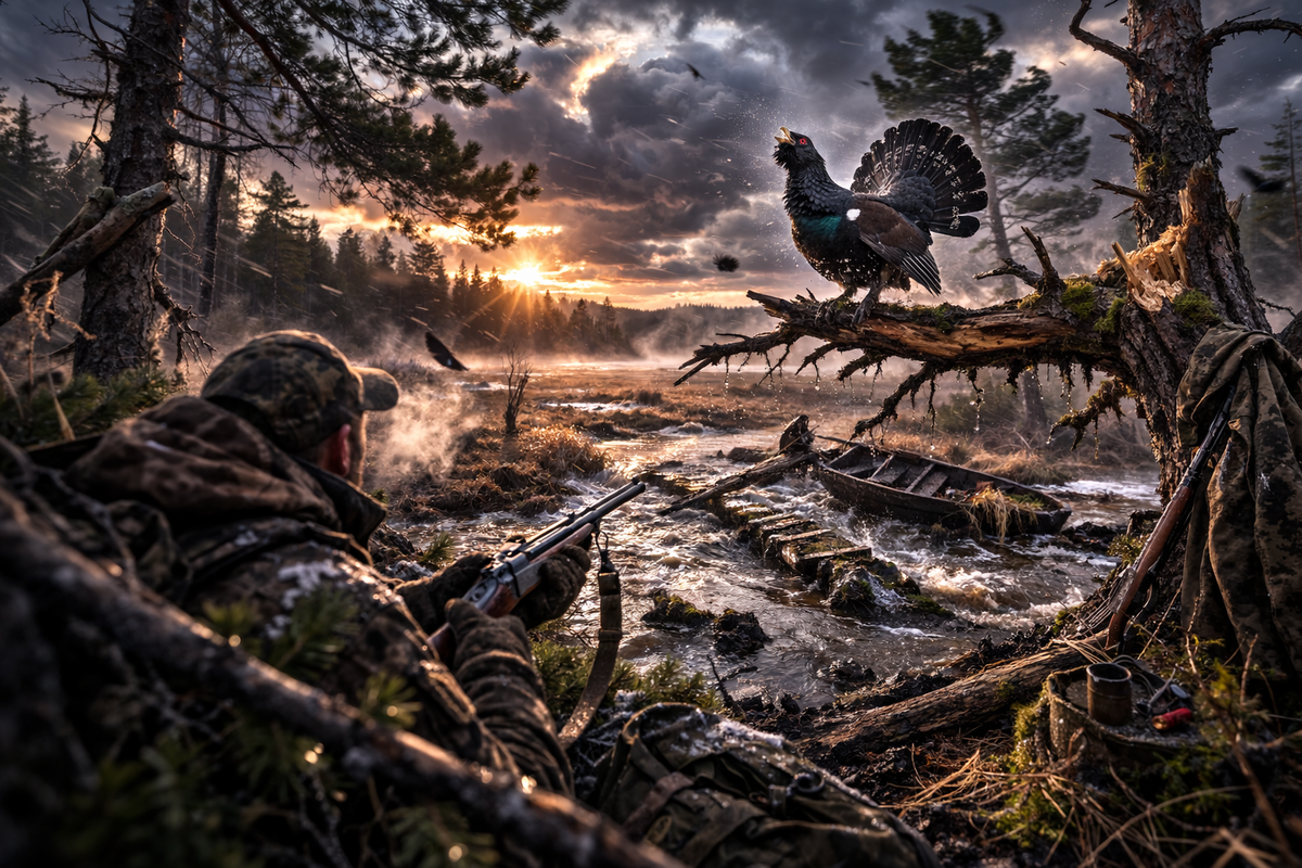 Есть утро, когда ты выходишь к болоту не за выстрелом — а за звуком. За тем самым глухим, хриплым, металлическим щёлканьем, которое начинается в полной темноте и будто собирает лес в одну точку. Весенний ток — это не просто охота. Это момент, когда тайга сама выбирает, даст она тебе шанс или нет. В тот год весна пришла рано. Снег сошёл быстро, ручьи зазвенели, и казалось — всё сложится правильно. Мы с Витькой ходили на это болото уже третий сезон. Старые ели по краю, кочки, островки сухой травы и небольшой подъём с соснами — именно там чаще всего садился главный петух. Но за день до выхода поднялся ветер. Не ураган, не шторм. Просто устойчивый, северный, сырой. И это хуже всего. Глухарь любит тишину. Он может петь и в мороз, и в сырость, но сильный ветер ломает песню. Щёлканье тонет, ток распадается, птица не держит место. В четыре утра мы уже шли по просеке. Темнота была густой, как вода. Фонари выключили заранее — дальше только на ощупь. Под ногами хрустела старая хвоя, влажная после