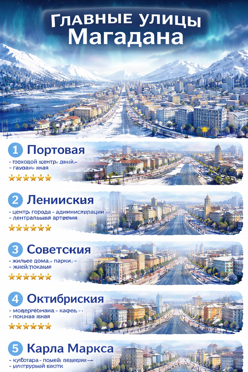 P.S. Магадан учит гулять быстро. Не потому, что спешат, а потому, что мороз не прощает долгого стояния. Каждая улица — это испытание. Портовая дует ветром с Охотского моря, Ленинская холодная и серьёзная, Советская спокойная, как сама жизнь на краю. Октябрьская греет молодостью, Карла Маркса — культурой. Выбирайте улицу по тому, чего вам не хватает в этот момент. И помните: в Магадане не гуляют долго. Здесь гуляют с целью. 🏔️❄️