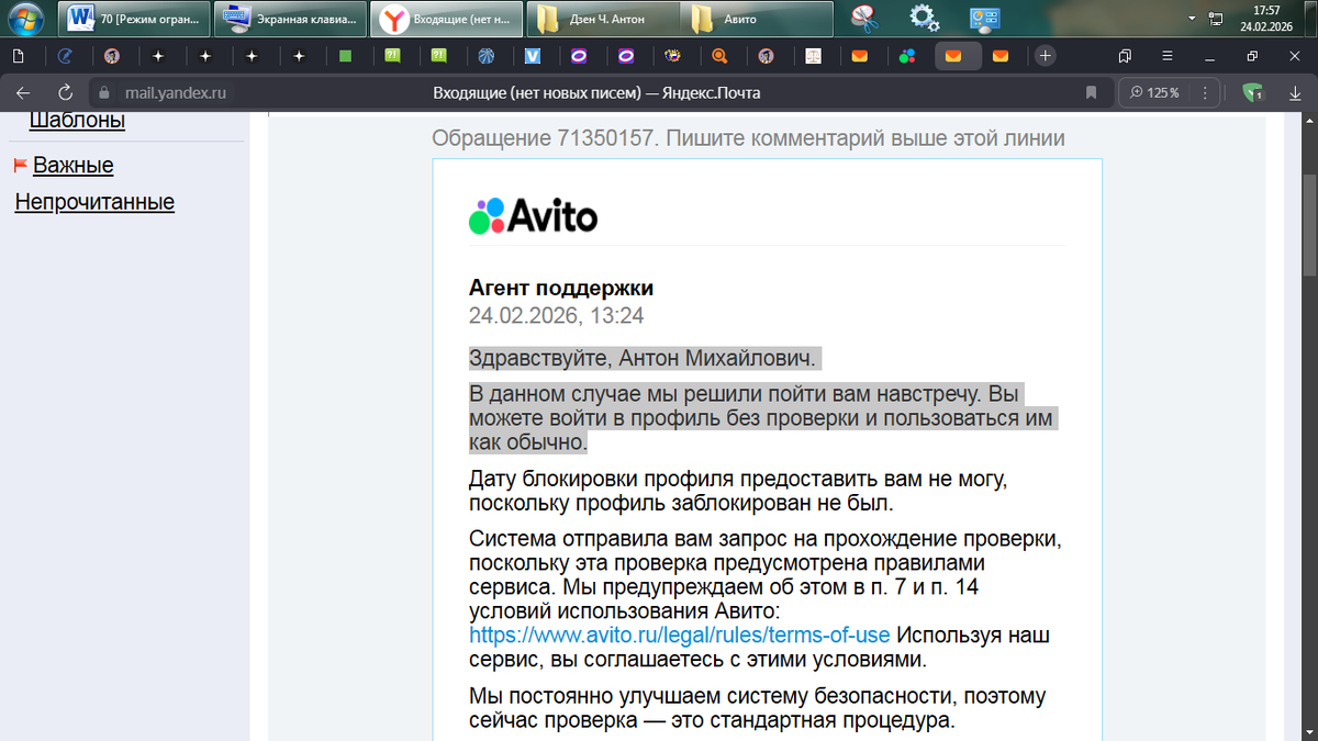 Написал: Обязательное требование (новое рассмотрение) «к Avito о дате блокировке профиля». Запись: Avito блокирует профили и вымогает паспорта РФ: https://dzen.ru/a/aZqMXcluTlMzbmBX Так профиль Avito под Антон Михайлович Комаринский 79508549314 был заблокирован. В связи с настоящими действиями Avito, возникает вопрос о дате блокировке профиля? В силу ч. 1. ст. 165.1. Гражданский кодекс Российской Федерации (часть первая) от 30.11.1994 № 51-ФЗ заявления, уведомления, извещения, требования или иные юридически значимые сообщения, с которыми закон или сделка связывает гражданско-правовые последствия для другого лица, влекут для этого лица такие последствия с момента доставки соответствующего сообщения ему или его представителю. Так с учетом законодательства, требую: дать юридически значимое сообщение о дате (день, месяц, год) и времени блокировки профиля Avito под Антон Михайлович Комаринский 79508549314 за подписью ответственного лица. На настоящее требование получены ответы: 1) Здравств