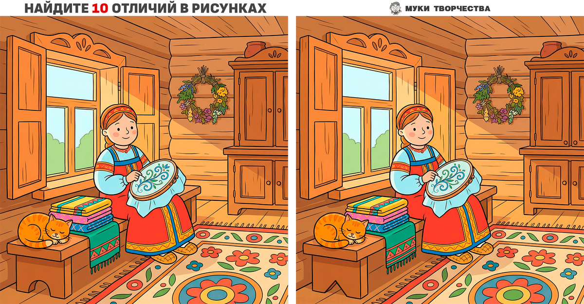 Сегодня задачка на внимание со сказочным сюжетом. Художник нарисовал две похожие иллюстрации с рукодельницей Василисой Прекрасной. Но в одном рисунке он сделал 10-ть отличий. Помогите Василисе найти все отличия, тогда возможно её не похитит злой Змей Горыныч. А вы сделаете полезное упражнение для ума и памяти. Подсказка будет в конце статьи, на случай если совсем станет тяжело. Но лучше найдите отличия самостоятельно, а потом просто сверьте результаты. Горизонтальный вариант: Василиса Прекрасная за рукоделием Вертикальный вариант: Василиса Прекрасная за рукоделием Ого! Тут Ещё Больше Задачек На Внимание: Подсказка-ОТВЕТ НИЖЕ: