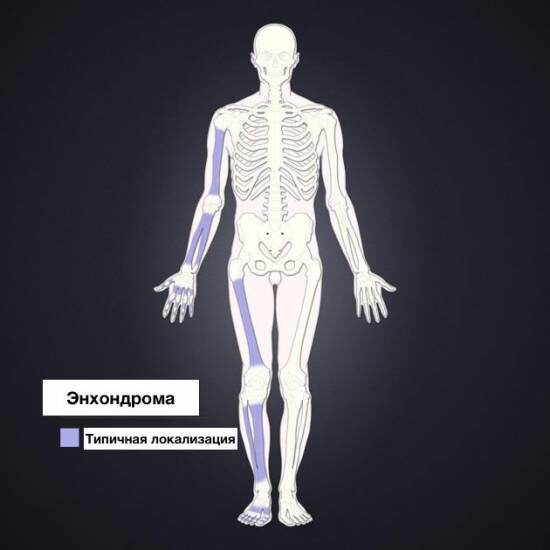 Энхондрома-относительно доброкачественная интрамедуллярная хрящевая опухоль c характерной картиной визуализации, которая часто встречается в коротких трубчатых костях кистей и стоп, дистального отдела бедренной кости и проксимального отдела плечевой кости. Иногда встречаются в литературе под общим термином "хондрома низкой степени злокачественности" В основном является случайной находкой. Обычно бессимптомны, но могут осложняться патологическим переломом или трансформироваться в хондросаркому низкой степени злокачественности (редко). Рентгенография и компьютерная томография При крупных поражениях зона просветления окружена эндостальным склерозом с истончением и вздутием коры, при этом компьютерная томография позволяет оценить целостность кортикального слоя. Кальцификация в поражении варьирует от точечных до кольцевидных. При локализации в фалангах, энхондромы характеризуются экспансивным литическим ростом. При других локализациях проявляются экспансивным ростом с характерной картиной