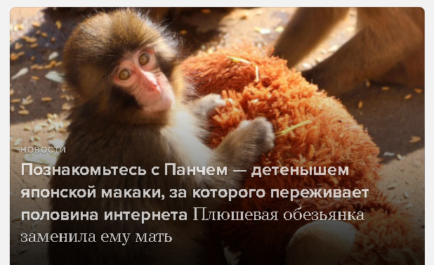 Познакомьтесь с Панчем — детенышем японской макаки, за которого переживает половина интернета. Плюшевая обезьянка заменила ему мать