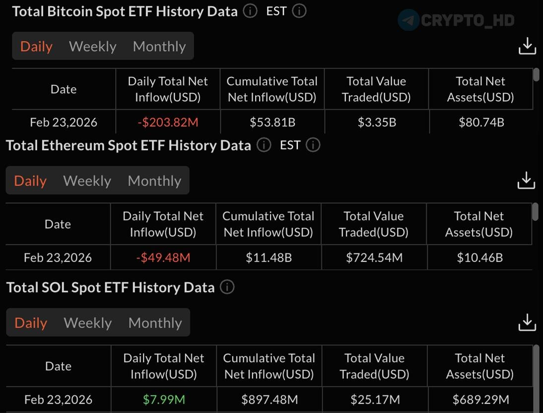 ) Финпотоки крипто-ETF за вчерашний день: ▫️#BTC = -$203,820,000. ▫️#ETH = -$49,480,000. ▫️#SOL = +$7,990,000. ▫️#LINK = +$1,850,000. ▫️#AVAX = +$2,580,000. ▫️#XRP, #LTC, #HBAR, #DOGE = $0. Компания BlackRock сегодня перевела 1184 BTC ($114,4m) и 24,472 ETH ($44,5m) на биржу Coinbase Prime – кошелек Crypto Headlines