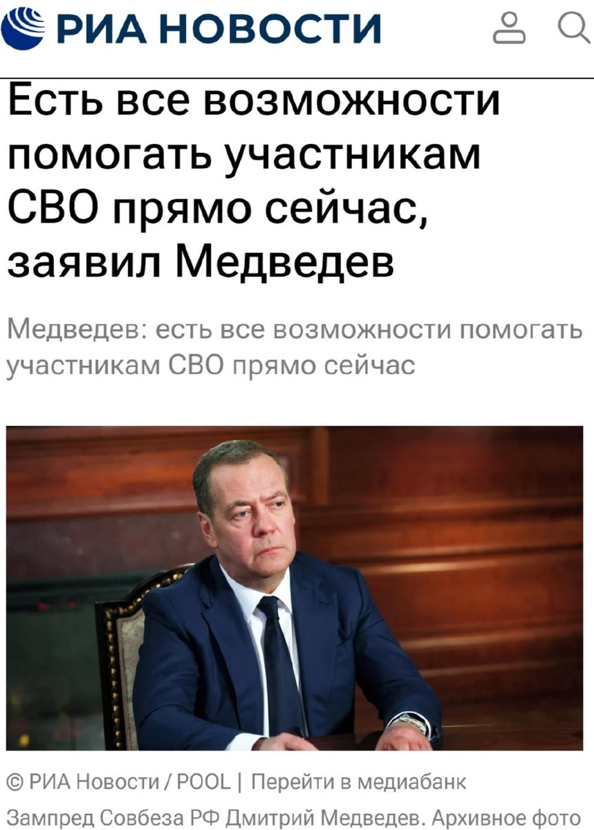 : О поддержке участников СВО Заместитель Председателя Совета Безопасности РФ, Председатель партии "Единая Россия" Д. А. Медведев 11 февраля встретился в подмосковных Горках с лидерами общественного мнения и представителями ведущих отраслей, предложив им подключиться к работе над народной программой партии. В своём выступлении Д. А. Медведев затронул и тему поддержки участников специальной военной операции: "У нас сейчас есть всё возможности, подчеркиваю, чтобы делать всё, что нужно для участников СВО, прямо сейчас. Не через 20 лет, как это у нас было принято говорить о том, что партия торжественно обещала, нынешнее поколение советских граждан будет жить при коммунизме. Но, мы с вами коммунизм не строим и наша задача помочь прямо сейчас".